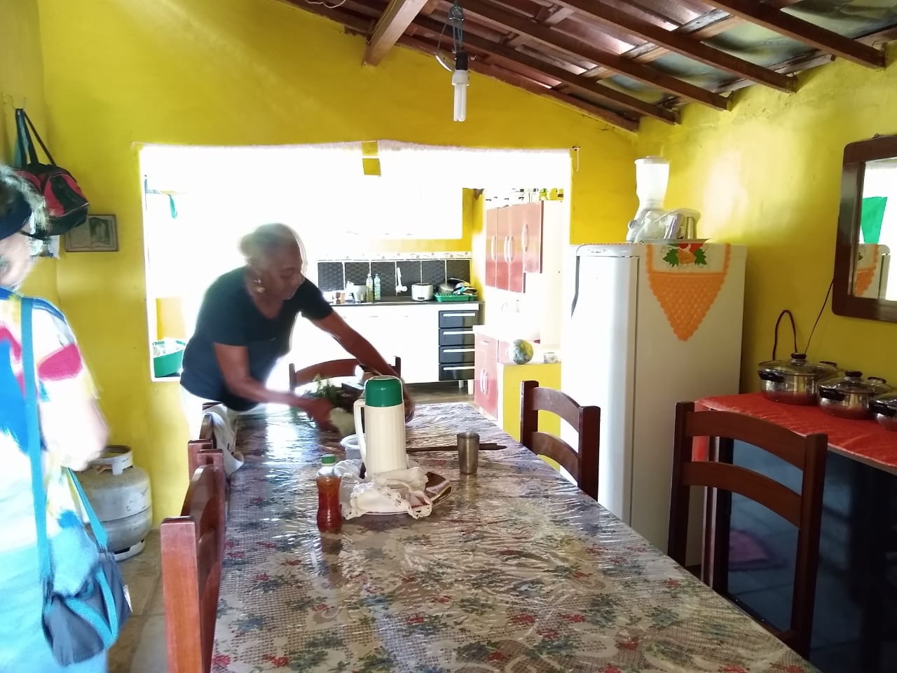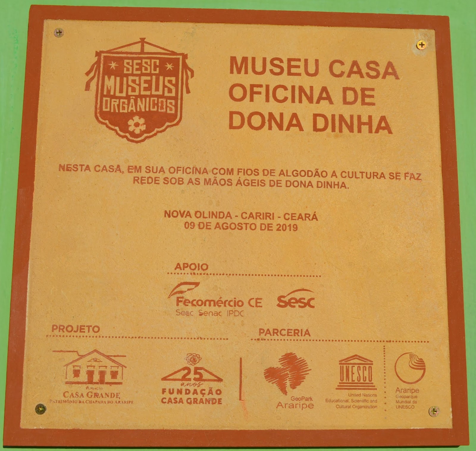 No quintal, repousam as partes do tear que tanto contribuíram para sua arte: liço, queixa, braço, orgo, pente, rasteira, cartel, canela e lançadeira. Com carinho e espontaneidade, Dinha brinca, afirmando que as madeiras de Ipê e Peroba Rosa que as compõem são mais antigas que suas próprias lembranças.