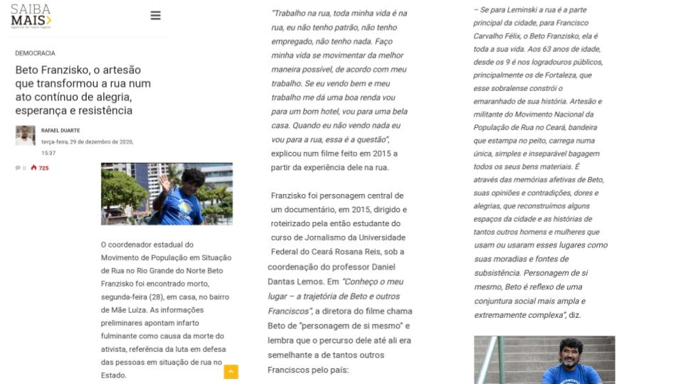 Trabalho de Conclusão de Curso: "Conheço o Meu Lugar - A Trajetória de Beto e Outros Franziskos". Rosana Braga Reis. Documentário em Audiovisual, 39 Minutos. Jornalismo, UFC (2015).