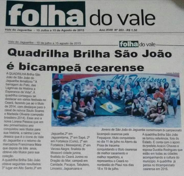 Fundada em 2011, contradizendo a modernidade, na cidade de São João do Jaguaribe/CE, o Grupo Junino Brilha São João, participante de 08 (oito) Edições do Festejo Ceará Junino, de origem simples, tradicional, com caracterizações típicas do São João de raiz, surgiu dando continuidade ao trabalho da tradicional quadrilha “Arraiá São João Batista”, que encerrou suas atividades por ocasião da partida prematura de seu presidente e ex-parlamentar da Câmara Municipal, Sr. Fernando Luís.O Vale do Jaguaribe é reconhecido por ser o celeiro da Cultura Popular cearense voltada para as manifestações do ciclo junino. Em si tratando da cidade de São João do Jaguaribe, a mesma carrega consigo uma identidade de raiz, em face de sua história. Ânticas casas, capelas e prédios públicos compõem o cenário da pacata cidade, que se revela em cores e alegrias nos festejos juninos, época de devoção ao santo padroeiro, que todos os anos recebe homenagens, ao passo das quadrilhas e ao som das sanfonas e repentes.
