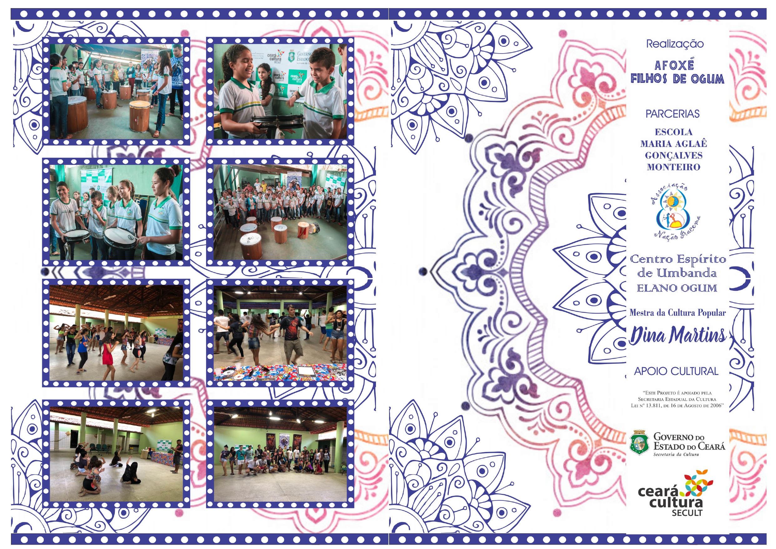 AFOXÉ FILHOS DE OGUM 2019 - PLANTANDO A SEMENTE NA ESCOLA, COLHENDO FRUTO NA SOCIEDADE. PROJETO EDUCACIONAL E CULTURAL DE VALORIZAÇÃO DA AFRICANIDADE. O projeto beneficiará mais de 50 crianças de 09 a 13 anos em situação de venerabilidade social. Aqueles que são negros poderão reafirmar sua beleza e riqueza através do estudo e perpetuação da identidade afro e os que não são, também poderão se enxergar como parte daquilo tudo, da música que “faz acontecer” o “Afoxé”. As oficinas estarão sendo realizadas na Escola Municipal Maria Aglaê. A grande culminância será um desfile do candomblé de rua, vestidos e munidos de instrumentos do Afoxé.No decorrer dos anos o AFOXÉ FILHOS DE OGUM criou uma parceria firme e constante com as Escola Municipais de Canindé e se tornou mais uma ferramenta para estimular a educação, o aprendizado e a permanência das crianças na escola. Através de ações artísticas culturais promovidas pelo coletivo Cultural e a coordenação das escolas, o “ESTAR NA ESCOLA” passa a ser mais prazerosa, pois tem mais atrativos e a novidade encanta os alunos.