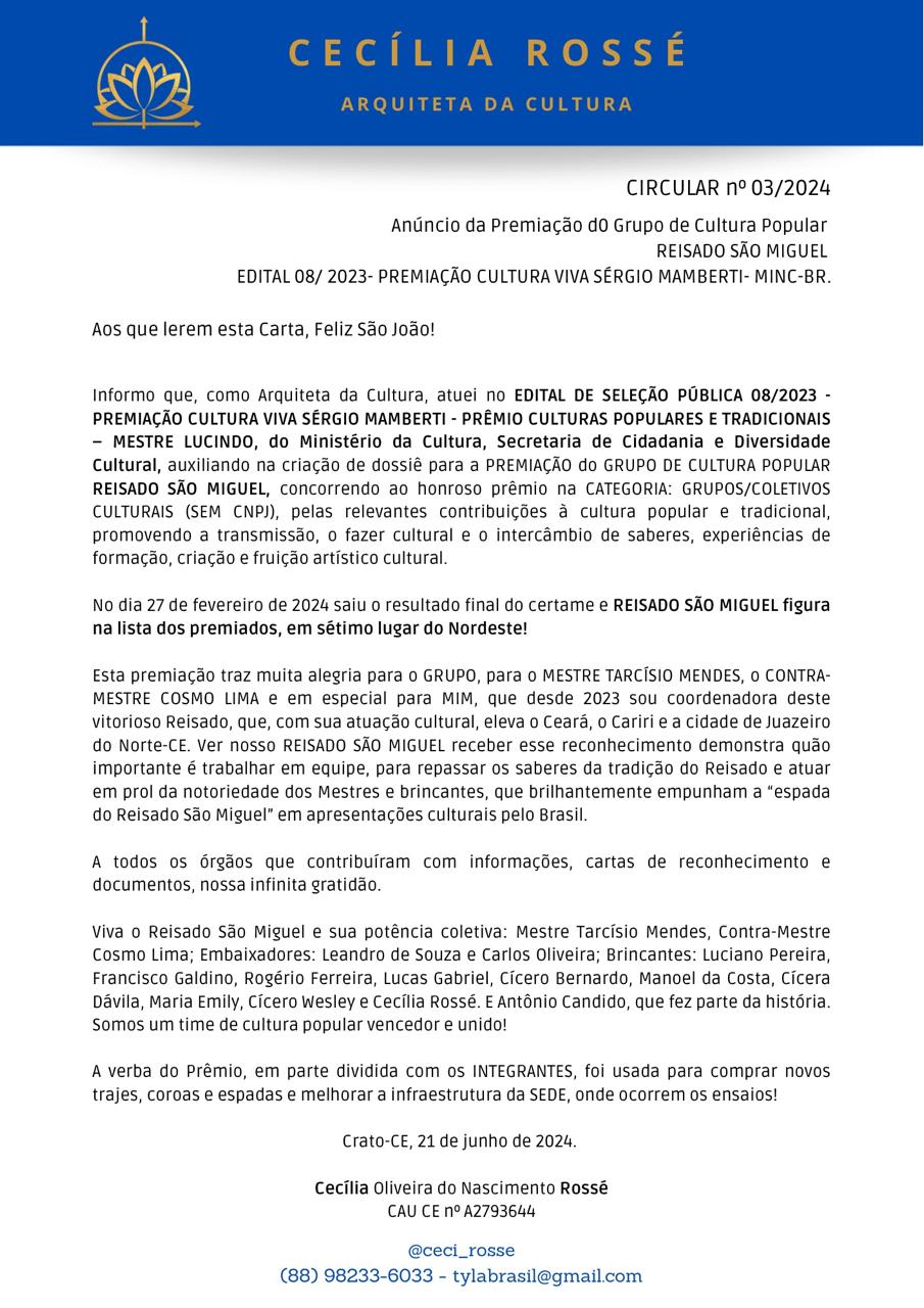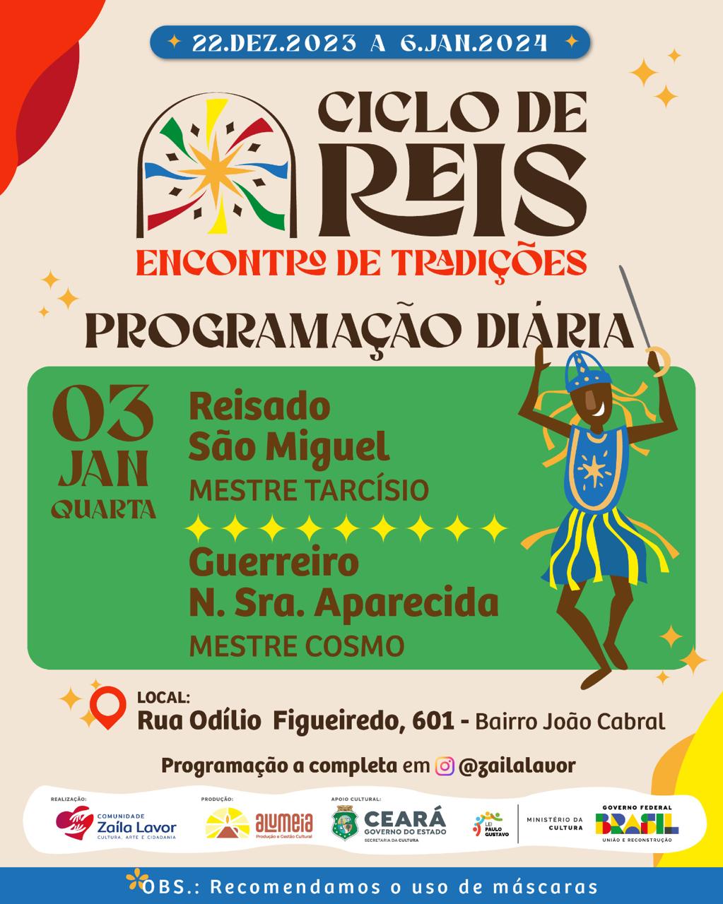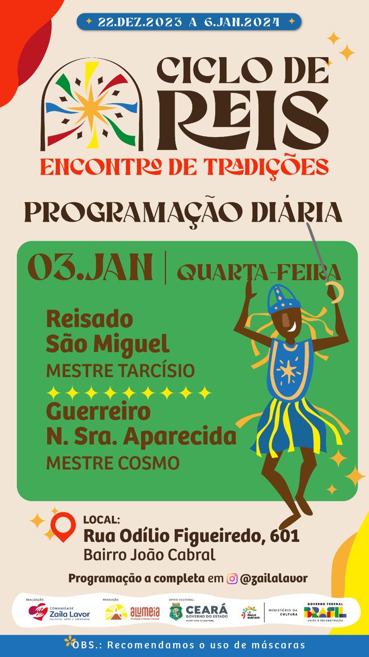 O artista Cosmo de Souza Lima, natural de Juazeiro do Norte - CE, tem 34 anos e iniciou sua carreira ais 8 anos, participou de diversos grupos de culturas e da cooperativa de artistas populares filhos da terra do padre Cícero, uma associações no bairro João Cabral. Participou de grupos como Reisado São Sebastião, Reisado Nossa Senhora de Fátima, Reisado Nossa Senhora da Dores, Reisado dos Irmãos, Reisado São Miguel e hoje está atualmente comandando as Guerreiras Nossa Senhora Aparecida, dançando e cantando. O grupo apresenta em festivais, festas do município e religiosas, participou de projetos como, Ciclo de Reis, Canto de Reis, Festival de Arte e Educação da UFC de Fortaleza, participou também da Renovação da Casa Grande de Nova Olinda e do Encontro dos Mestre das edições Juazeiro do Norte, Limoeiro do Norte, Aquiraz e Crato, tendo em seus projetos e objetivos de tira as crianças do meio da rua, ensinando os seus saberes e seu conhecimento da cultura.Vídeos