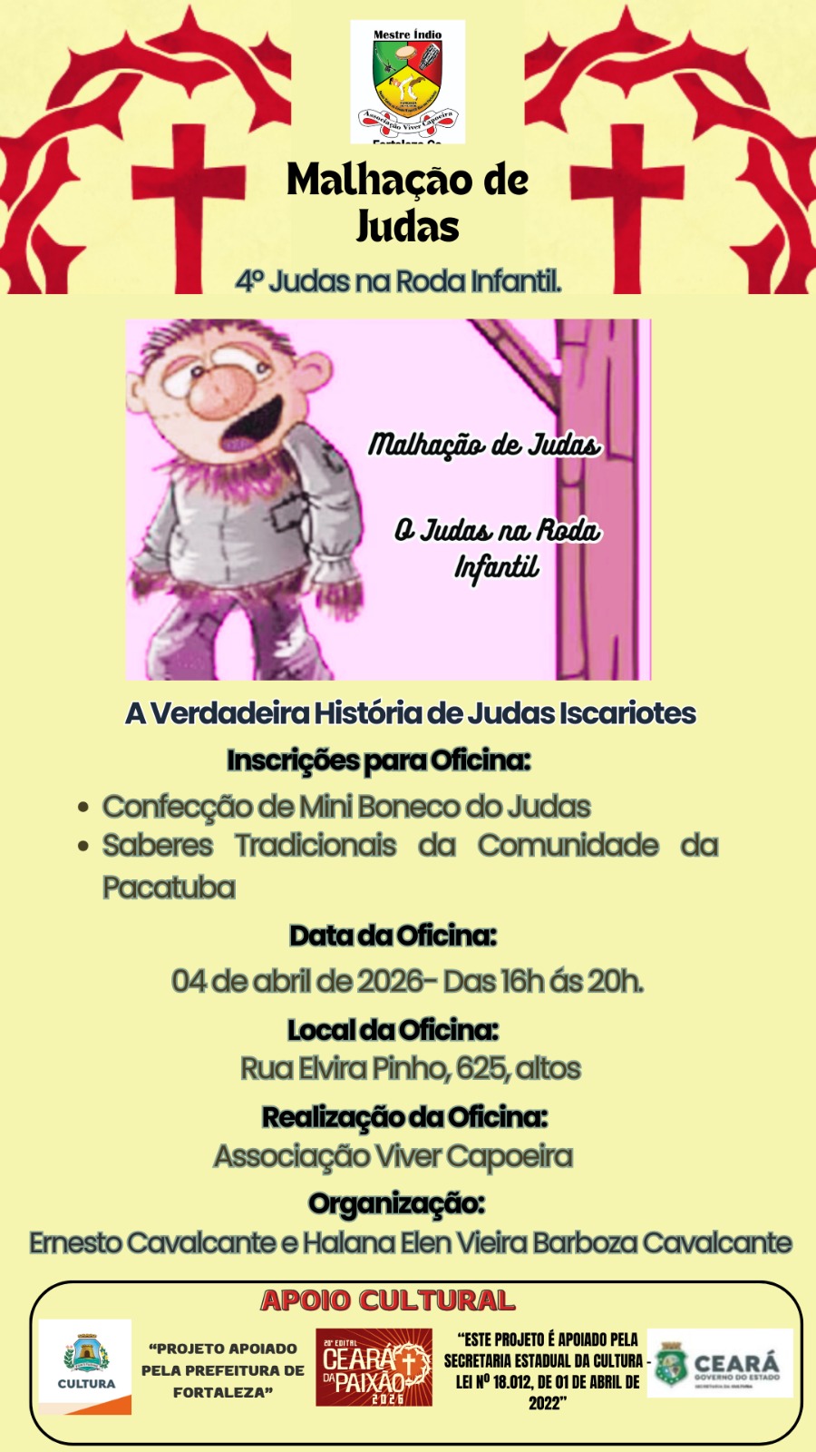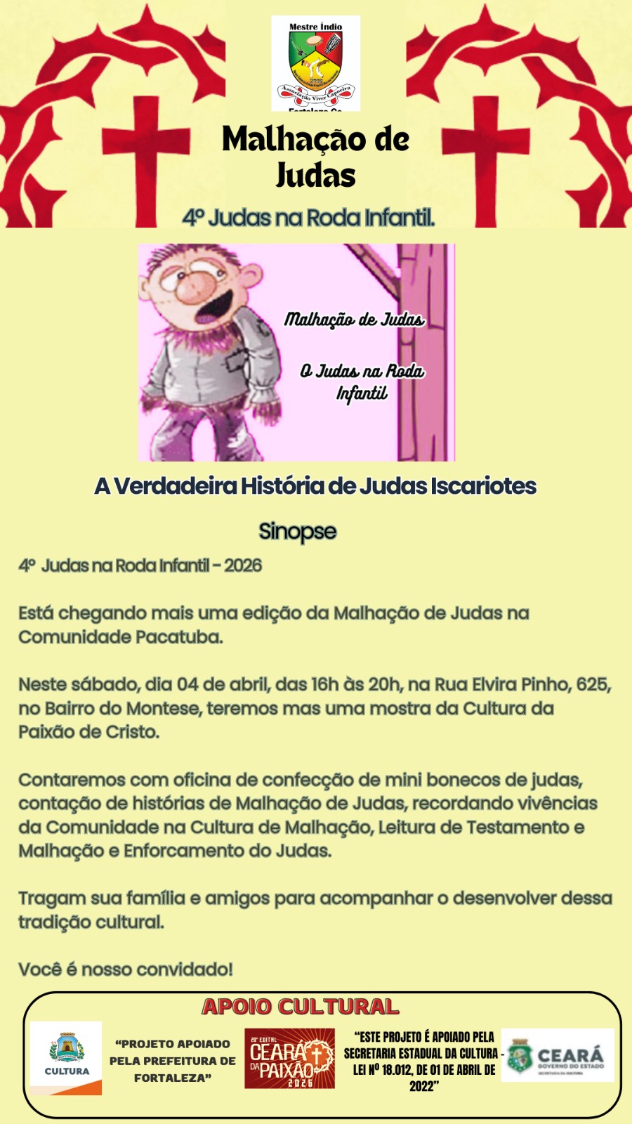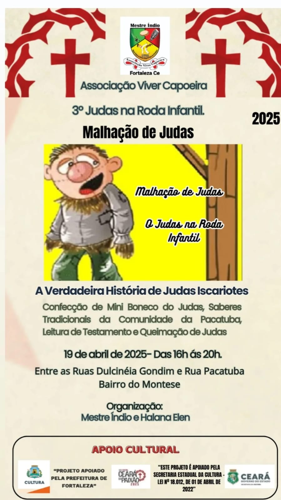 O sábado de aleluia é popularmente o dia da malhação do Judas. A tradição foi trazida pelos portugueses e espanhóis e implantada em toda a América latina. Neste dia, é comum vermos bonecos trazendo nomes de políticos, personalidades do meio artístico ou até mesmo figuras populares nos bairros, pendurados em árvores e postes. Atrás deles, uma multidão de adultos e crianças armados com paus, prontos para malhar e queimar o Judas, dando seguimento à tradição secular.Diante do cenário a Associação Viver Capoeira na pessoa do Mestre Índio e Halana Elen realizam juntamente com os moradores das Ruas Pacatuba e Dulcinéia Gondim no bairro Montese desde 2011 a Malhação de Judas por meio de leitura do testamento e enforcamento do Judas na Rua Pacatuba tratando-se de uma ação cultural e educativo que visa reviver o momento da paixão de Cristo na qual há o enforcamento de Judas Iscariotes no sábado de Aleluia, tradição passada de pais para filhos a mais de duas gerações.