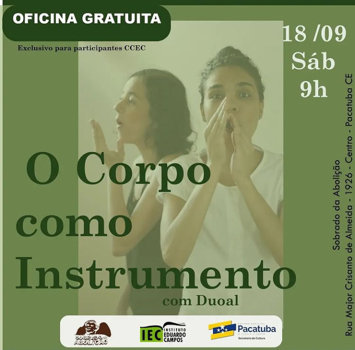 Atuou como arte educadora em projeto de Canto Coral do Programa de Assistência Básica à Pessoa Idosa – PABI da Prefeitura Municipal de Fortaleza (2010 a 2013). Ainda na área formativa, realizou aulas e oficinas de Música no estado do Ceará para públicos de todas as faixas etárias em projetos e espaços como: Escola Viva Música Viva (2009); Centro Cultural Banco do Nordeste (2011); Projeto “Música é para a vida” (SCJCC / SEDUC-CE / 2013 e 2014); Projeto Ponto de Cultura Afoxé ACABACA (2014); Projeto “Arte Música e Espetáculo” - MSMCBJ (Movimento de Saúde Mental Comunitária do Bom Jardim – ONG / 2014); Theatro José Alencar (ocupação artística em 2017); Escola de Narradores, escola de formação para narradores orais/contadores de história/storytellings (2018, 2019 e 2020); Teatro Cena Casarão (2018); Espaço Cazuá de Cultura (2019); Eco Aldeia Flecha da Mata (2019 e 2020); Curso Técnico em Dança da Escola Porto Iracema das Artes (2018); ONG Beatos, Cariri CE (2019); Escola de Dança Casulo (2020); Curso Técnico em Dança do Centro Cultural do Grande Bom Jardim (2020 e 2021); Projeto “Uma Ruma” do Nodo Coletivo CE (2021).