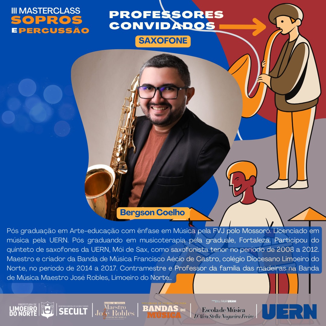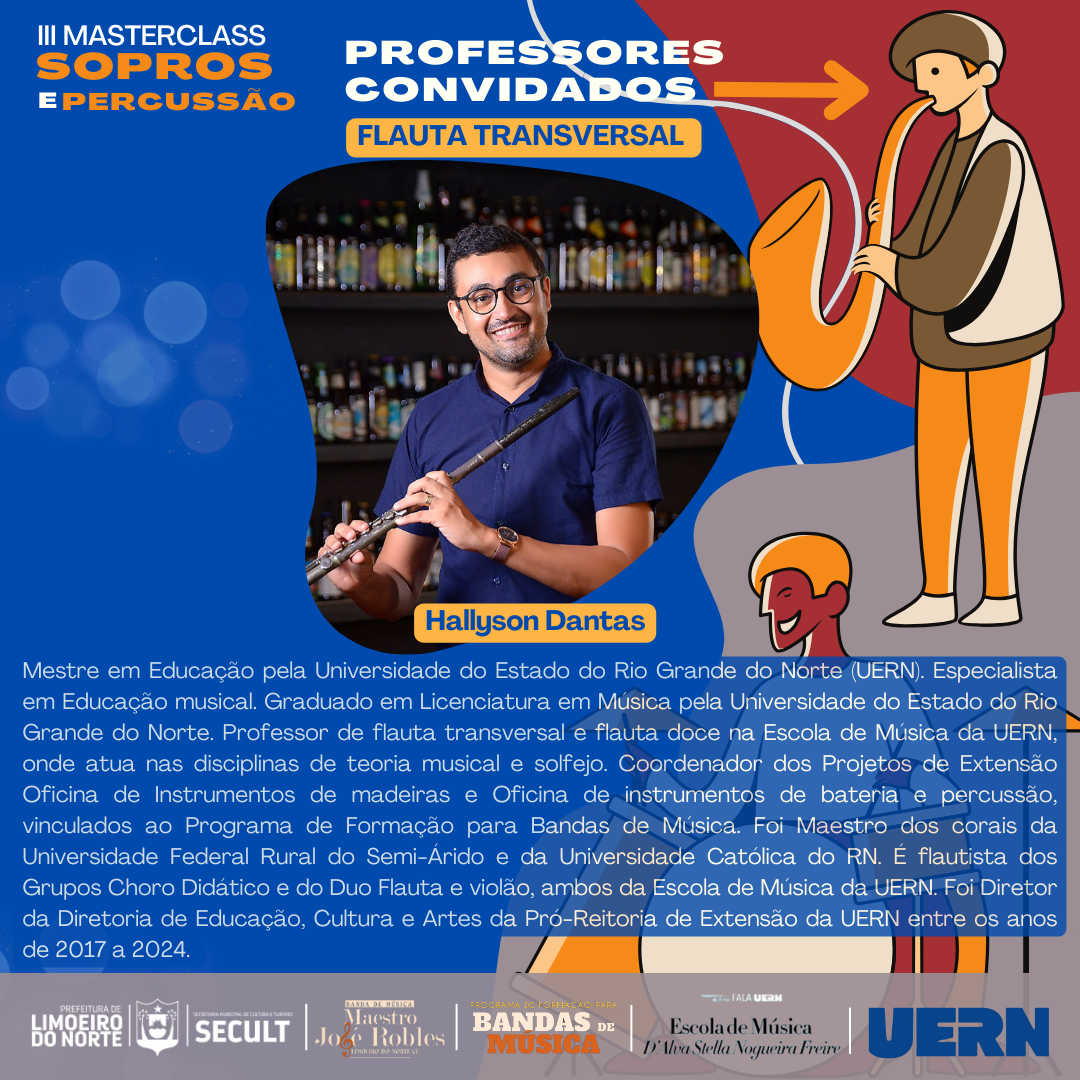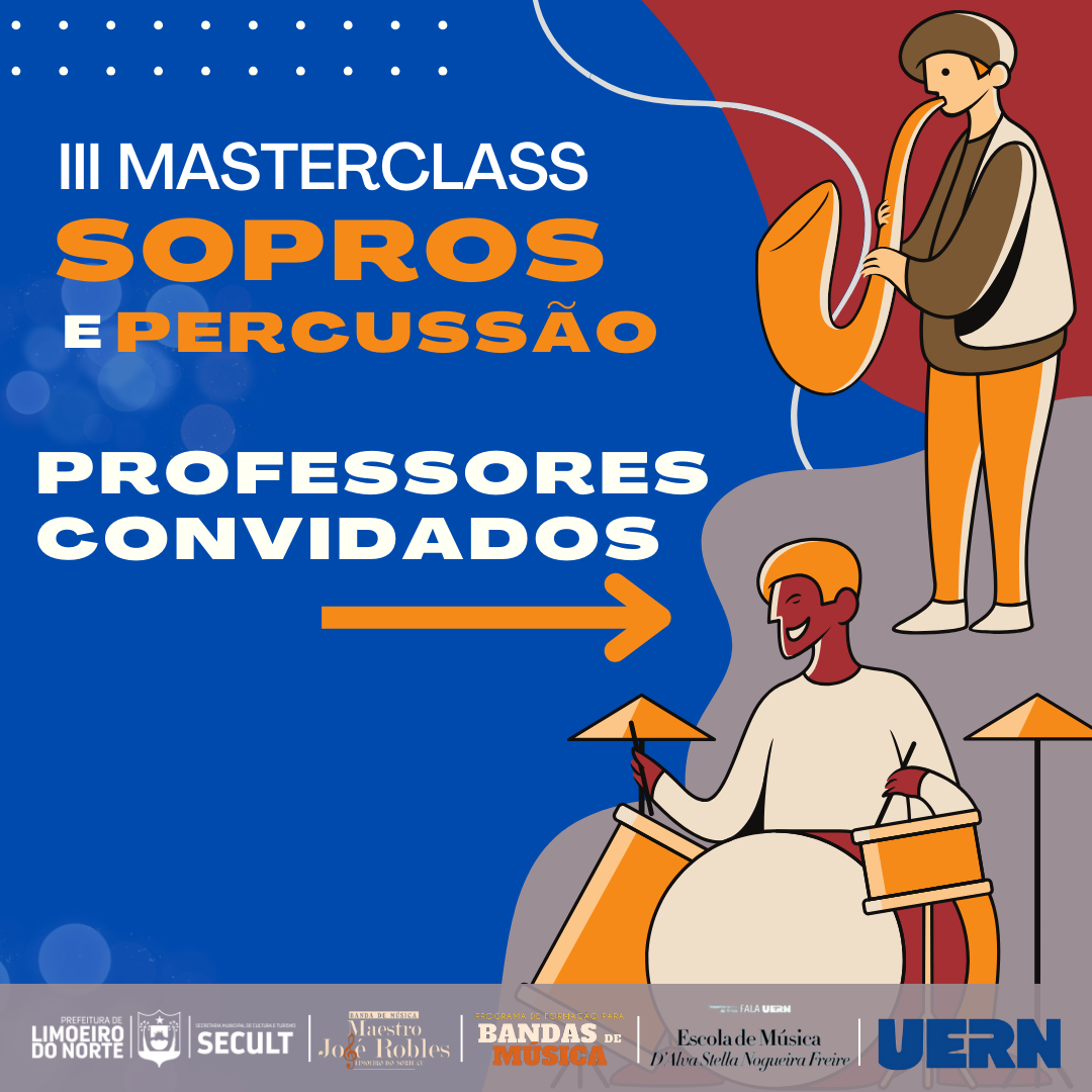 III MASTERCLASS SOPROS E PERCUSSÃOA Prefeitura Municipal de Limoeiro do Norte, por meio da Secretaria Municipal de Cultura e Turismo – SECULT, em parceria com o Programa de Formação para Bandas de Música da Universidade Estadual do Rio Grande do Norte - UERN, tem o prazer de realizar o III MASTERCLASS SOPROS E PERCUSSÃO.