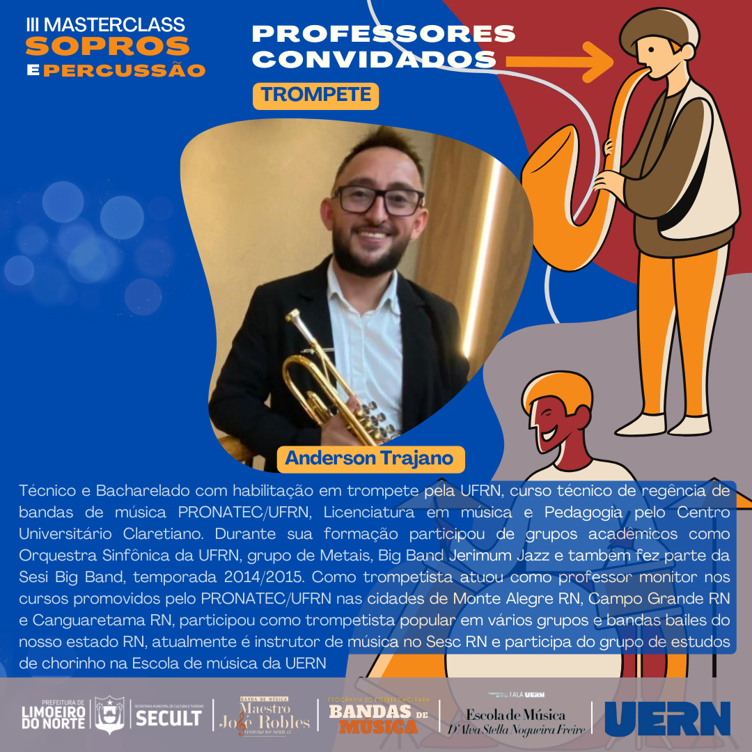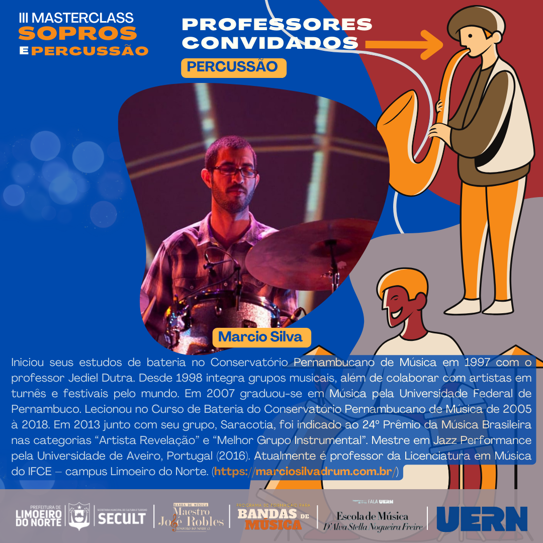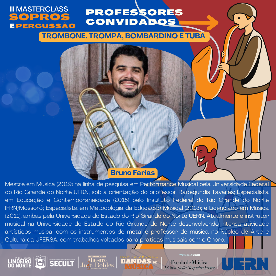 III MASTERCLASS SOPROS E PERCUSSÃOA Prefeitura Municipal de Limoeiro do Norte, por meio da Secretaria Municipal de Cultura e Turismo – SECULT, em parceria com o Programa de Formação para Bandas de Música da Universidade Estadual do Rio Grande do Norte - UERN, tem o prazer de realizar o III MASTERCLASS SOPROS E PERCUSSÃO.