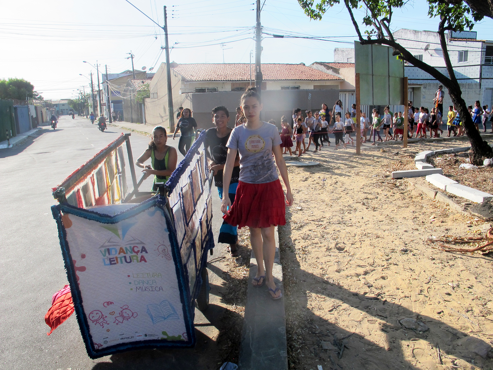 O Cortejo Literário é um projeto que tem como objetivo, levar de modo itinerante e festivo, a magia de um bloco de rua aliado ao saber literário, para as crianças, jovens e adultos da Associação e aos moradores do bairro Vila Velha. Essa produção cultural é realizada mensalmente e percorre as ruas levando, percussão, cena teatral, dança e literatura. Estimulando uma nova relação das atividades desenvolvidas na sede do Vidança, com os espaços públicos da região.
