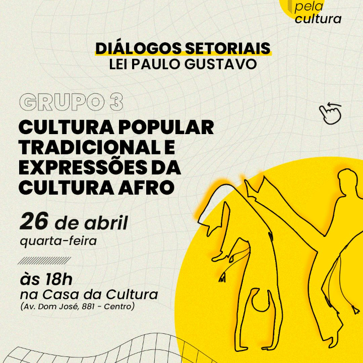 Evento Diálogos Setoriais - Lei Paulo Gustavo Sobral Cultura Popular Tradicional e Expressões da Cultura Afro Linguagens Cultura Tradicional Tags LPG LEI PAULO GUSTAVO SOBRAL Descrição curta Diálogo setorial promovido pela SECULT e Comitê de Acompanhamento da Lei Paulo Gustavo com as linguagens da Cultura Popular Tradicional e Expressões da Cultura Afro para a implementação da LPG no Município de Sobral. Sobre Responsáveis Classificação Etária: Livre Cine Falb Rangel ver mapaocultar mapa Dia 26 de abril de 2023 às 18:00 Endereço: Av. Dom José, 881 , Centro, 62015-400, sobral, CE Galeria Denunciar Contato Nome: E-mail: Tipo: Mensagem: Denúncia anônima Receber cópia da denúncia Cancelar Enviar Denúncia Enviando mensagem Nome: E-mail: Tipo: Mensagem: Mensagem anônima Enviar somente para o Responsável Receber cópia da mensagem Cancelar Enviar mensagem Enviando mensagem