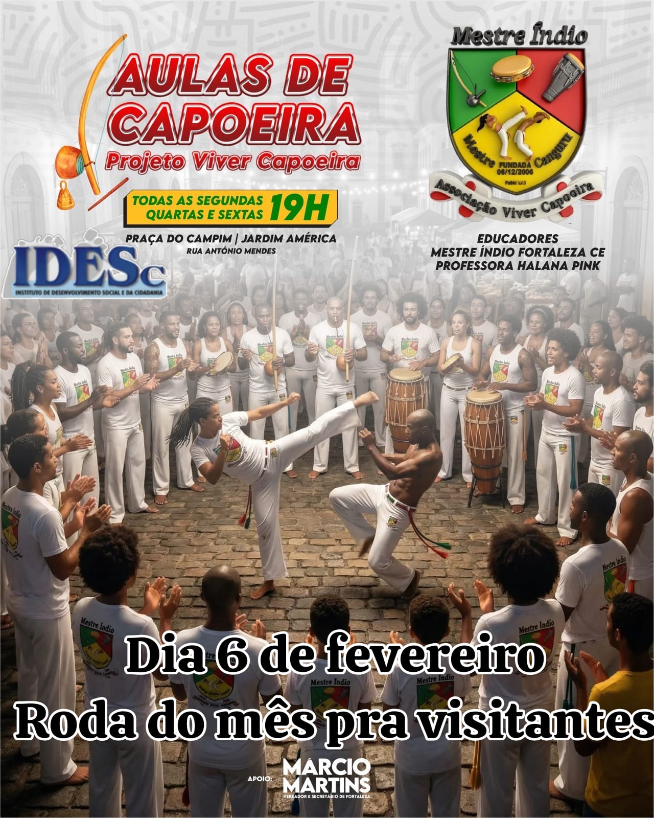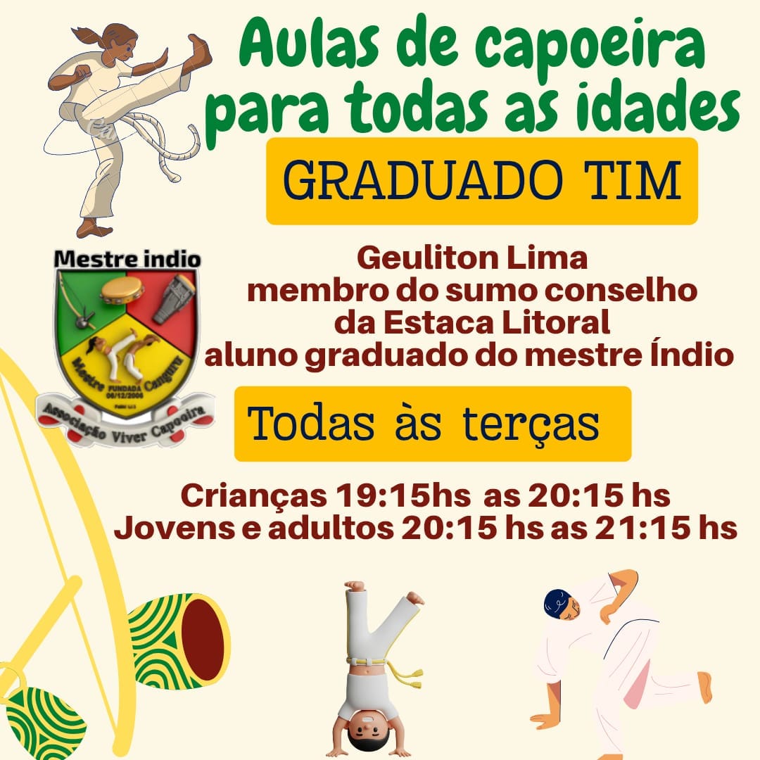 Escola de Cultura Viver Capoeira- Aulas de Capoeira ministradas pelo Mestre Índio da Associação Viver Capoeira nos dias de terça e quinta no horário das 19h15 ás 20h45 para faixa etária de 5 anos até 55 anos.