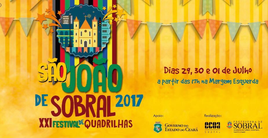 A Prefeitura de Sobral, por meio da Secretaria da Cultura, Juventude, Esporte e Lazer (Secjel), e da ECOA Sobral, com apoio do Governo do Estado, realizará durante os dias 29, 30 e 01 de julho, na margem esquerda do Rio Acaraú, o São João de Sobral, que vem repleto de atrações e atividades culturais, dentre elas a Cidade Cenográfica, o 21° Festival de Quadrilhas Juninas de Sobral, feira de artesanato e Shows Musicais.A Secretaria da Cultura, Juventude, Esporte e Lazer (Secjel) promete para os 3 dias de festividades, diversas programações culturais, composta pelo tradicional Festival de Quadrilhas, que esse ano conta com as categorias municipal, regional e mostra, trazendo muito arrasta pé e beleza, na disputa que reunirá, na Cidade Cenográfica, quadrilhas de toda a região norte do estado.